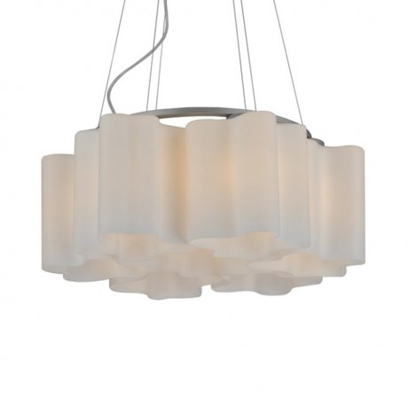 Шесть плафонов из белого стекла на подвесах, расположенные по кругу, металлическое основание.