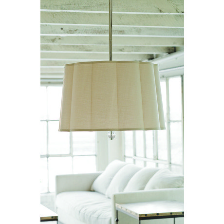 Подвесная люстра на штанге с оригинальным льняным абажуром натурального цвета. Люстра подойдет для оформления просторных светлых помещений, например, веранды или столовой зоны.