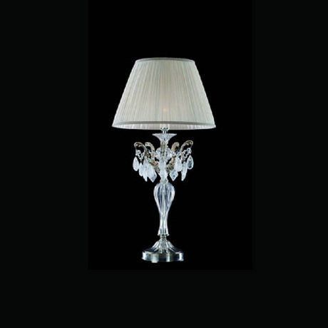 Настольная лампа с хромированной арматурой. Украшена прозрачными хрустальными подвесками. Абажур белого цвета. Лампа может стать изысканным украшением интерьера.