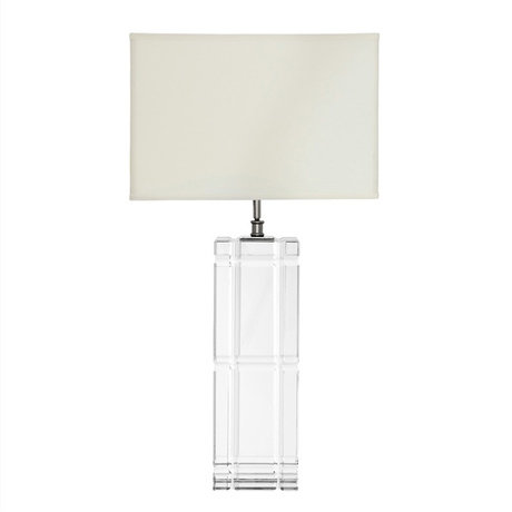 Настольная лампа Table Lamp Universal в современном стиле. На прямоугольное основание из прозрачного стекла установлен классический абажур из белой ткани. Цвет отделки металла - никель.