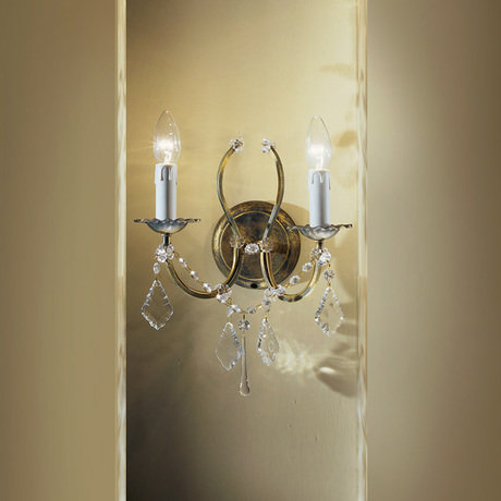 Бра 2-х рожковое из коллекции OLD STYLE на арматуре из металла, покрытого золотом с патиной. Декор: прозрачные подвески с кулонами из хрусталя. Количество лампочек: 2. Мощность: 2 x 40 Вт. Тип лампы: Накаливания, E14.