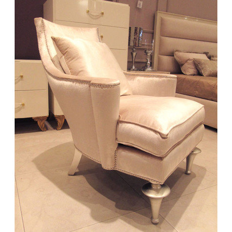 Кресло выполнено в стиле Ар деко. Ножки из массива дерева в отделке сусальное серебро. Для декорирования кресла использованы мебельные гвоздики серебряного цвета.