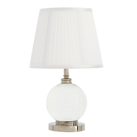 Лампа выгладит очень нежно. Прозрачная стеклянная ножка под хрусталь на основании из металла. Сколы, царапины отсутствуют. Светло бежевый абажур. Цвет соответствует фото.